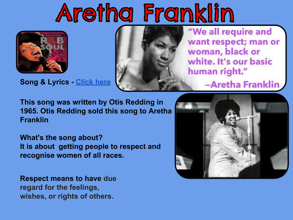 This is my poster about what I learnt about Aretha Franklin. Aretha Franklin is a female singer and she sang the song Respect.